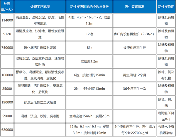 法國南希市水廠,處理能力10萬m3/d,采用0.9~1.0mm的顆粒活性炭代替砂炭層厚1.5m,主要用于去除水中的臭和味。美國西弗吉尼亞洲尼特羅水廠,處理能力2.66萬m3/d,采用單池面積72.3m2的顆粒活性炭吸附池2個,炭層厚1.5m,流速9~10m/h,在氯仿抽提物濃度較高時(約1000μg/L),去除率可達84%~89%。