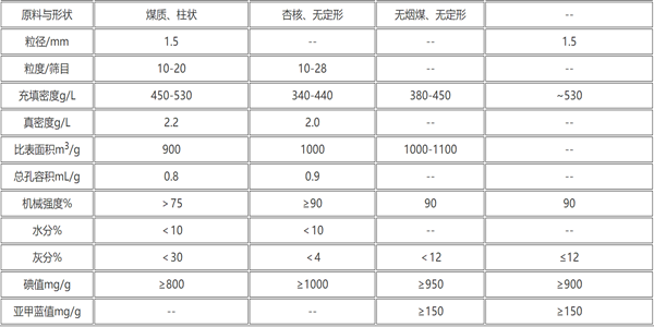國內用于水處理活性炭的性能及規格見表